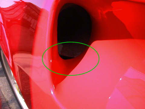 左右のインテークには、水の落ちる隙間があります。燃料タンクの後あたりに落ちるのかな?因みにこの奥はエアクリに続きます。左側はOILクーラーに続きます。 EU仕様でドイツ向けの車両は、この入り口に黒い網が付いています。メッシュはいくつだったか?覚えていませんが、ゴミの進入防止には役立つと思います。流体力学的には、案外と効率が落ちるらしいのですが、元々が、高速走行中には、ここに空気が強制的に流れ込むと思えないので、網の効果は街乗りレベルまでだと感じます。 それから、助手席の人が煙草を窓からポイ捨てしたら、ここから進入して、エアクリを焦した実例が有りますので、ゴミ類をポイポイ捨てるのは禁物です。 と、言うより止めましょう。ですね。 |