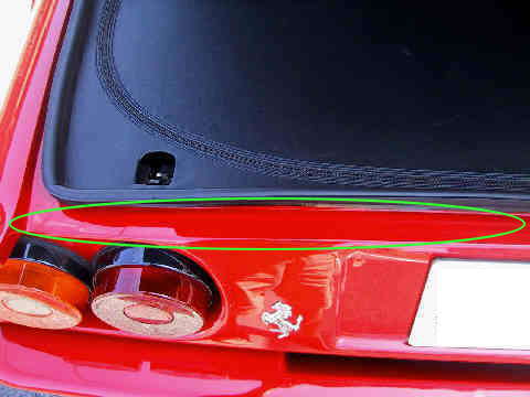 328には、エンジンの後に結構なスペースのトランクが有ります。ゴルフバッグは無理でしょうけど・・・。因みにファスナーで開閉します。 走行中の負圧でしょうか?トランクのウェザーストリップの外側に案外と砂汚れが付きます。ナンバーまわりも案外と汚れます。ここも水を流しながら洗うと良いでしょう。 トランク横の溝はルーフからのレインガーターの役目も有りますので、雨の後、洗車の後には水が溜まります。必ず拭き取る必要が有ります。 馬マークのまわりに、私の半ズボン姿が映り込んでいますねぇ。おー、お恥ずかしい・・・。 |
