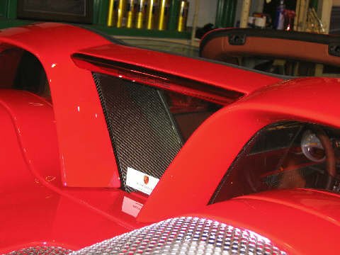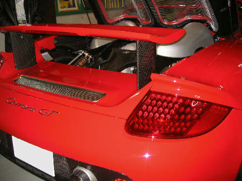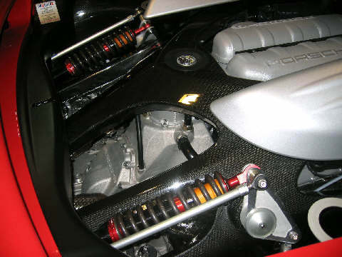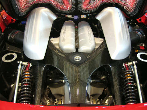 CarreraGTの心臓部です。V10-5.7L。4バルブ、ショートストロークで8400rpmまで回ります。両サイドの丸いのは、リヤフェンダー上部のNASAダクトからのブレーキ冷却です。レーシングカーお約束のインボードサスですね。当然フロントもインボードです。カーボンモノコックなのでしょうか、エンジンを包むようにカーボンフレームで武装しています。これには本当に圧倒されます。