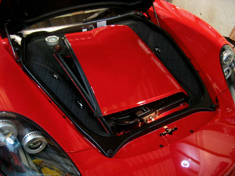 フロント周りです。どちらかと言えば、往年のルマンカーの流れでしょうか。ノスタルジー&テクノロジーの調和がセンス良いです。バブル形状のTOPは左右分割で収納できます。キチンと形抜きがしてあって良い仕事してます。革バンドで押さえるところなんかも伊達ですな。小さく見えるCUPは、センターロックの工具です。
