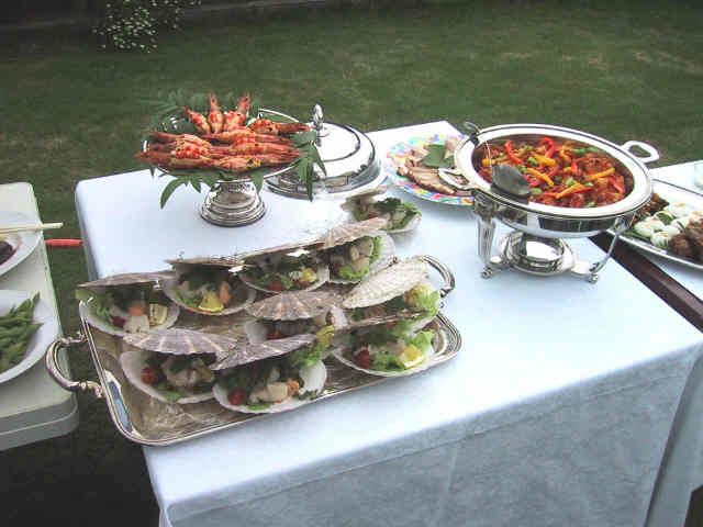 スパイダーとガレージを拝見したあとは、芝生のガーデンでバイキングをご馳走になりました。出張シェフがみえてまして、とても美味しかったです。それにしても、でかいホタテでした。写真はごくほんの一部で、まるで酒池肉林でした。わっはっは。。。