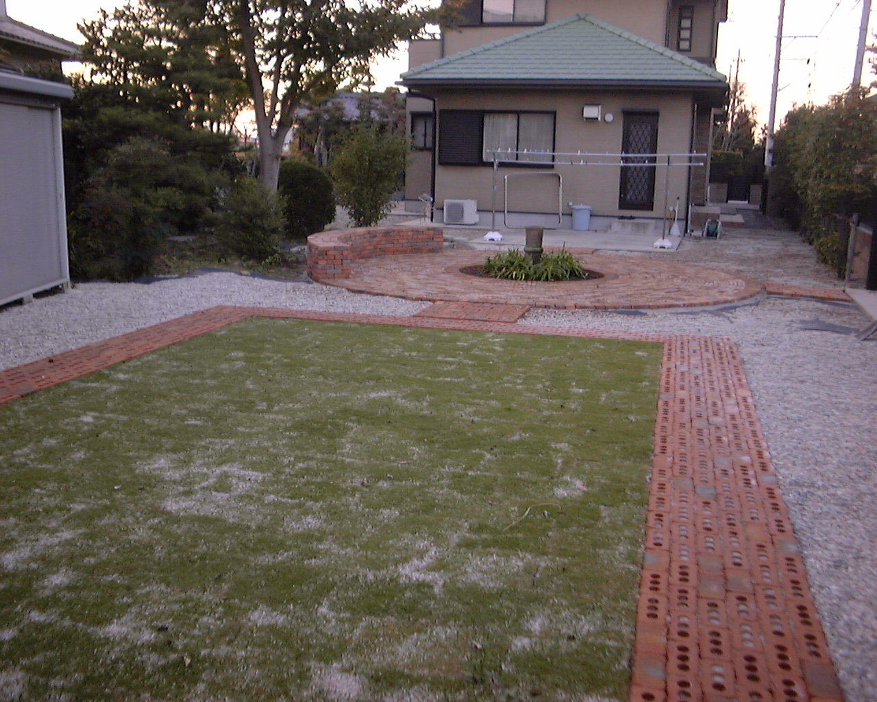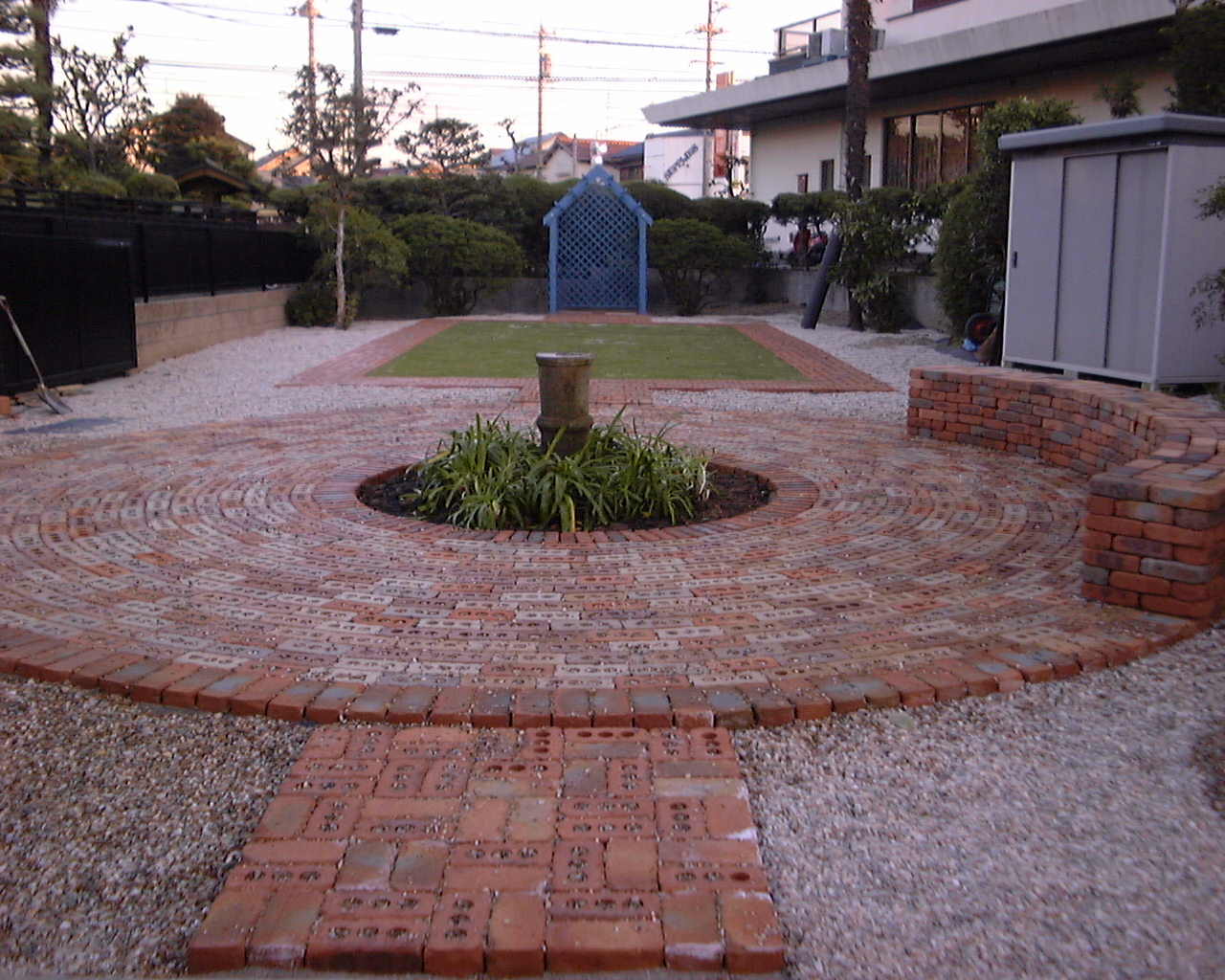 レンガのサークル、芝生、パーゴラを