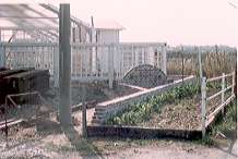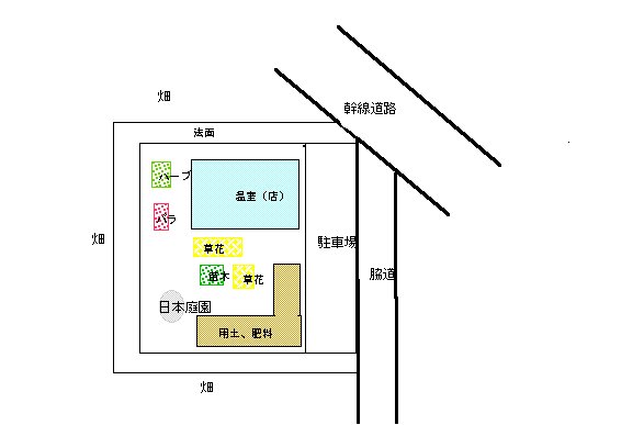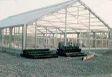 | この温室では植物の他に農薬、プラ鉢などの資材 勘定のためのレジ、従業員の控え室、倉庫も含めます 建設は関東の温室メーカーに依頼して作りました。 大きさは10mX18m、約60坪、側面はすべて ガラスサッシ、屋根と妻面はアクリルの波板です。 内部の床面は2/3は砂利を敷き、1/3は枕木を 敷きました。 |
