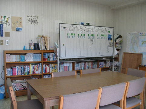 | ステップの教室の内部です。膝をつき合わせて、読書や学習に取り組んでいます。先生も隣に座って、個別に指導しています。 |