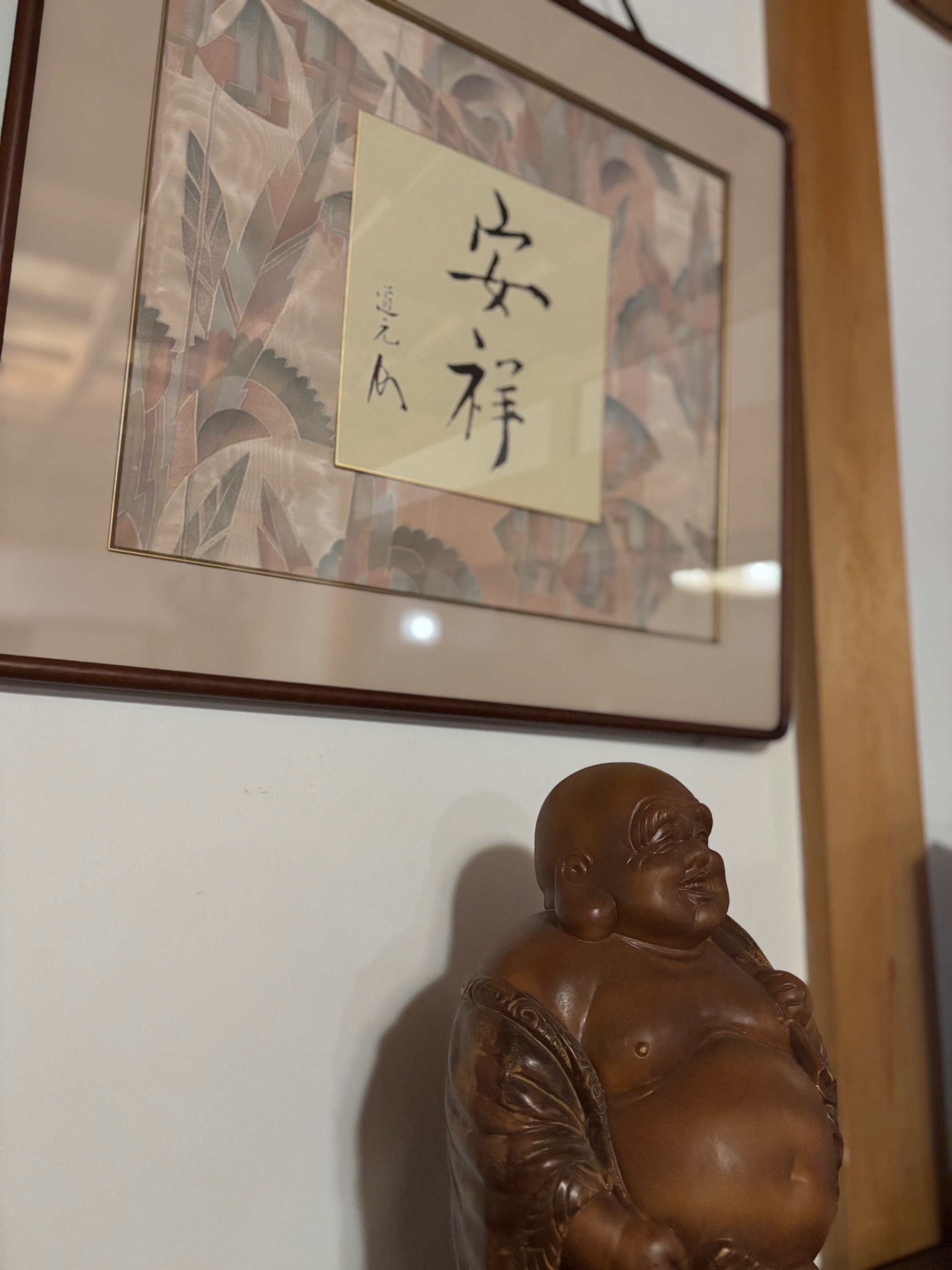 布袋尊は、七福神の中で唯一中国に実在した禅僧です。悠々自適(泣いて暮らすも一生。笑って暮らすも一生。同じ暮らすなら笑って暮らせ)といった楽天的な布袋和尚の生き方が、至福の象徴として当時の禅僧や人々の間で人気がありました。 大きな袋は、財を与えてくれる福袋とも円満な性格を作る堪忍袋とも言われています。また弥勒菩薩の化身ともいわれ不老長寿・開運招福・家庭円満・商売繁盛の神とされて親しまれています。 |